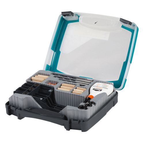 El juego de ensamblaje para bricolaje con 78 piezas contiene todo lo necesita para realizar ensamblajes de madera limpios con espigas de madera de 6, 8 y 10 mm de diámetro. La pieza central del juego es el maestro de ensamblaje rápido de wolfcraft. Con él, incluso los aficionados al bricolaje sin mucha práctica consiguen uniones planas, de rincón y en T perfectas. La plantilla para taladrar sirve para tablas de entre 12 y 30 mm de grosor y está provisto de dos pernos centradores, un tope ajustable, tres ranuras-guía integradas para espigas redondas y sus tres casquillos de acero correspondientes para espigas de 6, 8 y 10 mm. Además de la práctica plantilla para taladrar, el maletín de plástico contiene desde espigas hasta brocas para madera, marcadores, topes de profundidad y cola para madera. Como juego de principiantes para montar muebles o como maletín de emergencia para las reparaciones cotidianas, con el amplio juego estará preparado para cualquier caso.